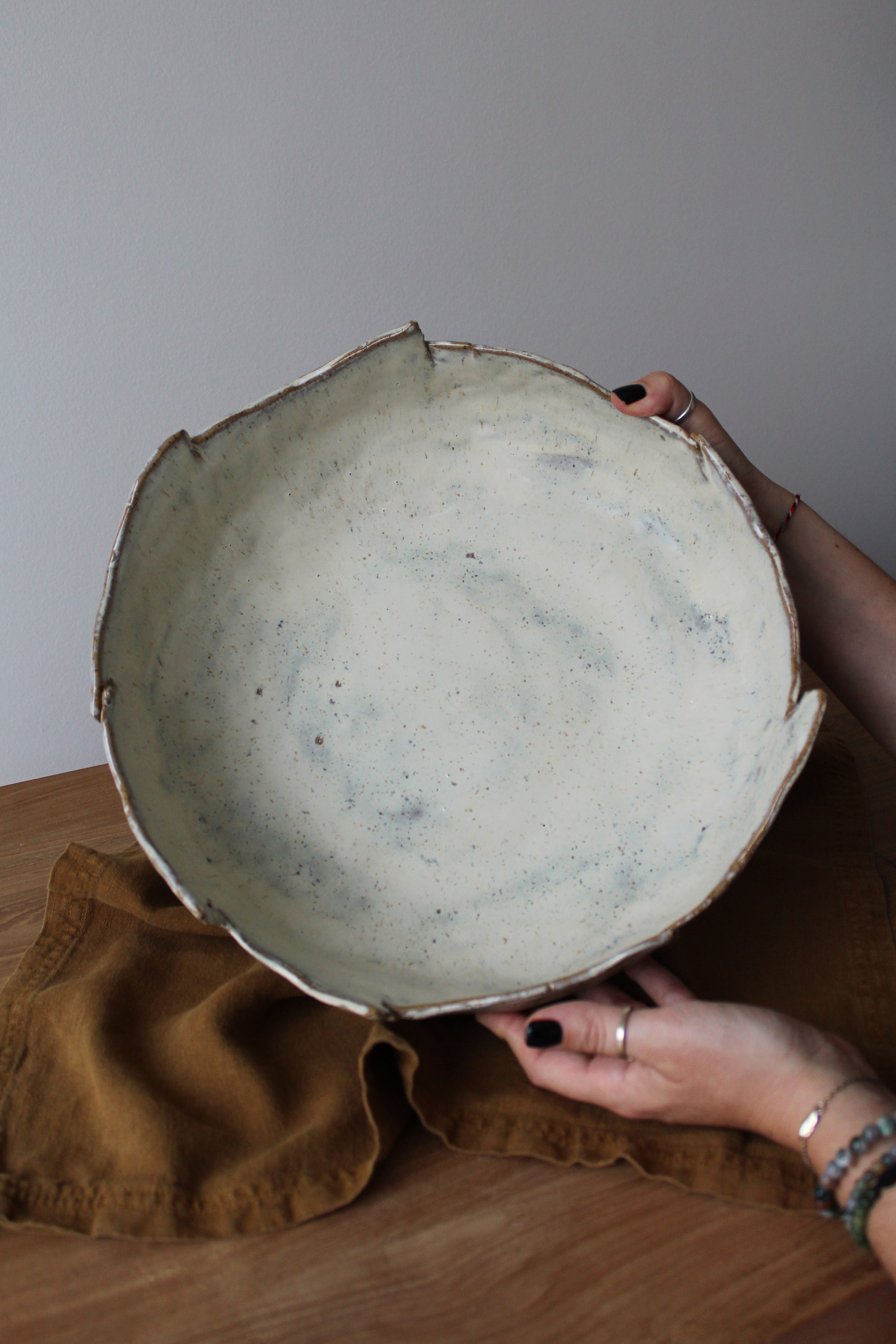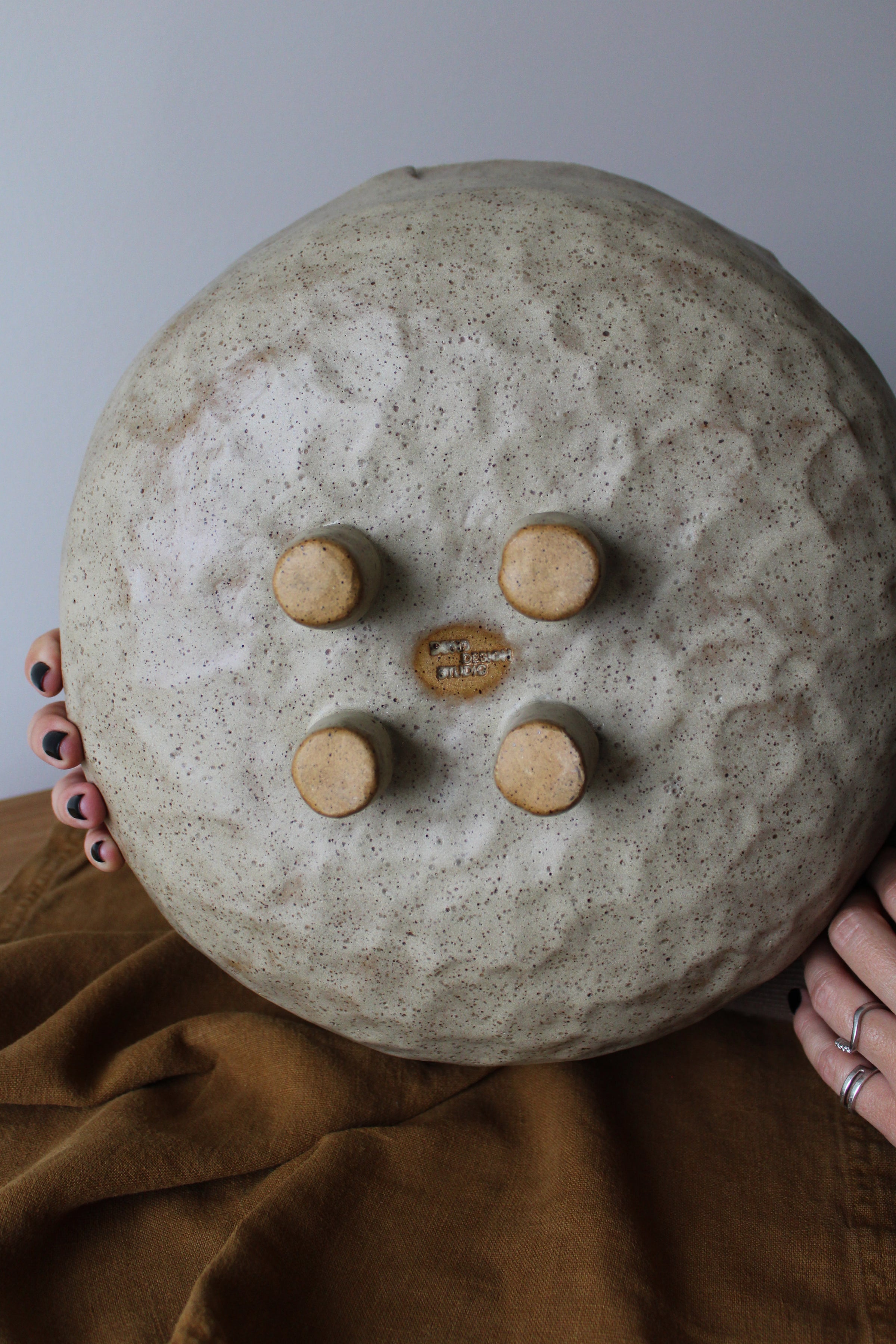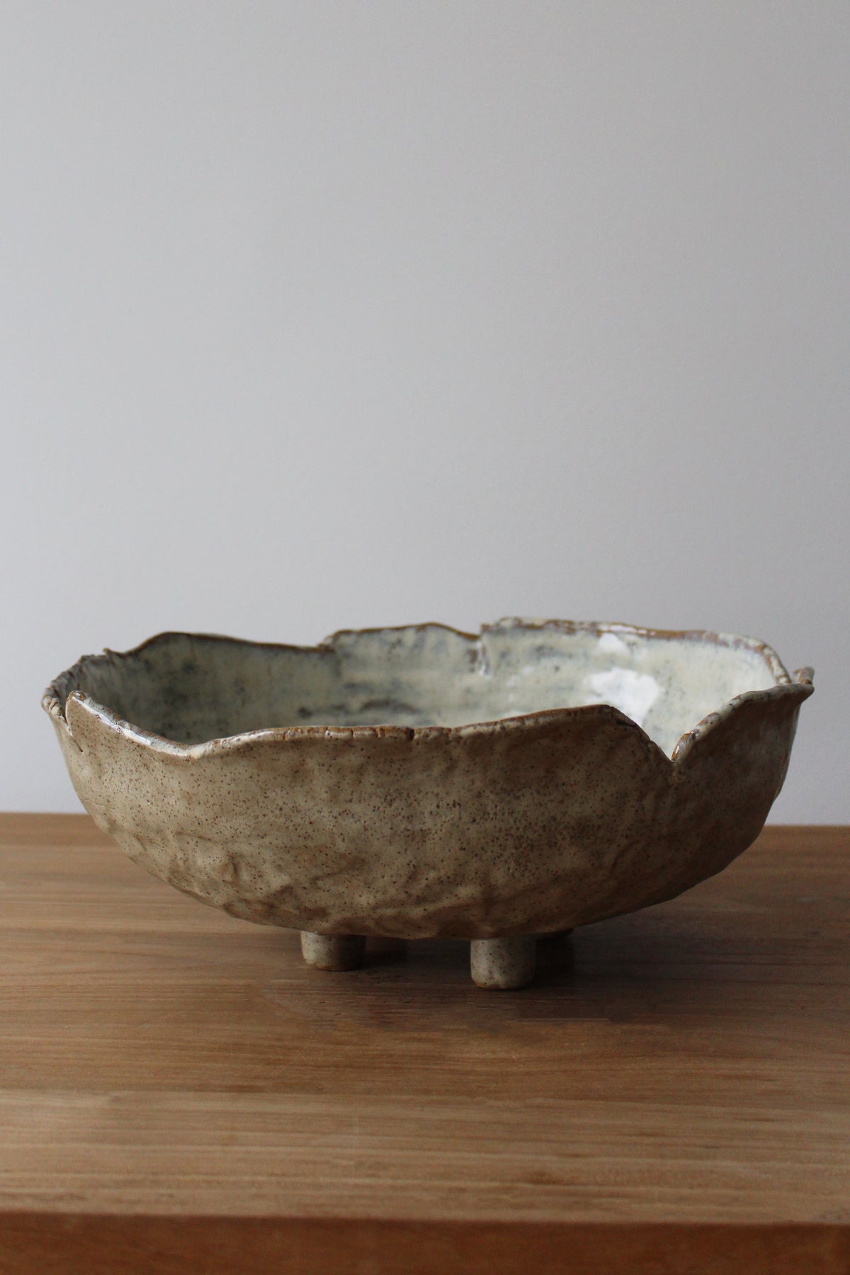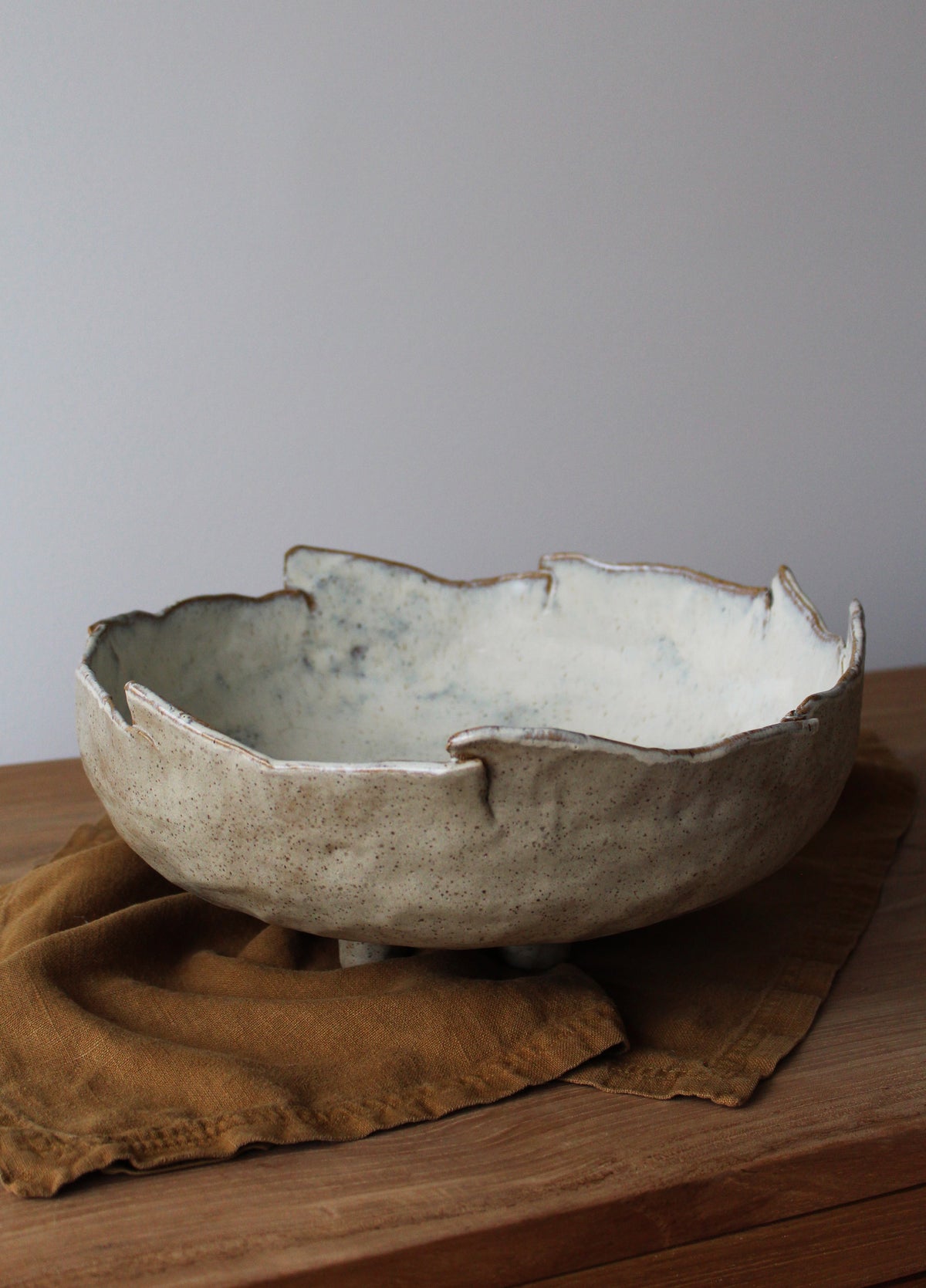 Each handcrafted ceramic bowl features a softly irregular rim and organic shape, making every piece slightly different and truly unique. The speckled matte exterior contrasts with the milky, hand-applied interior glaze, while small rounded feet give it a grounded, sculptural presence—perfect as a centerpiece, fruit bowl, or decorative accent.