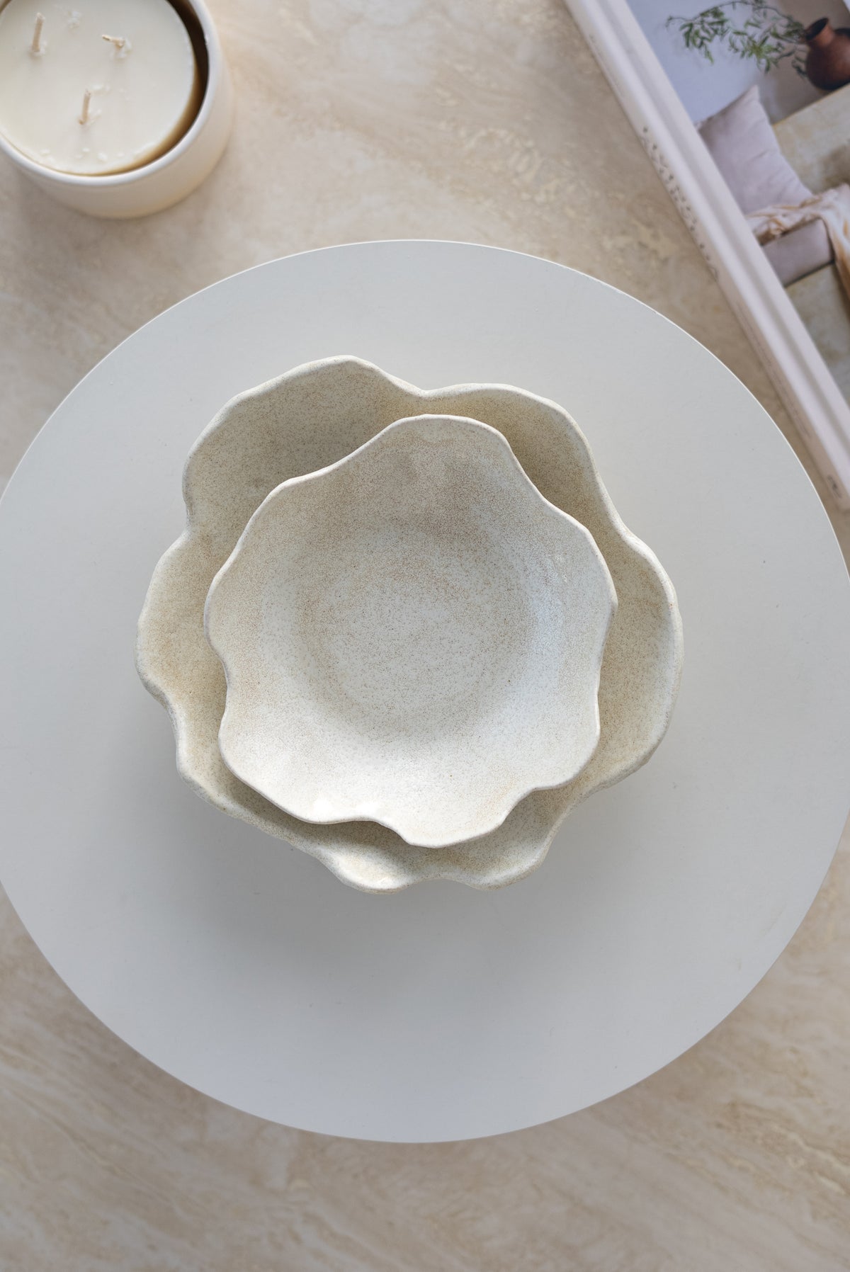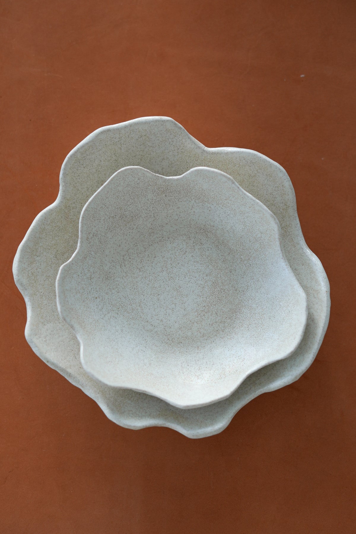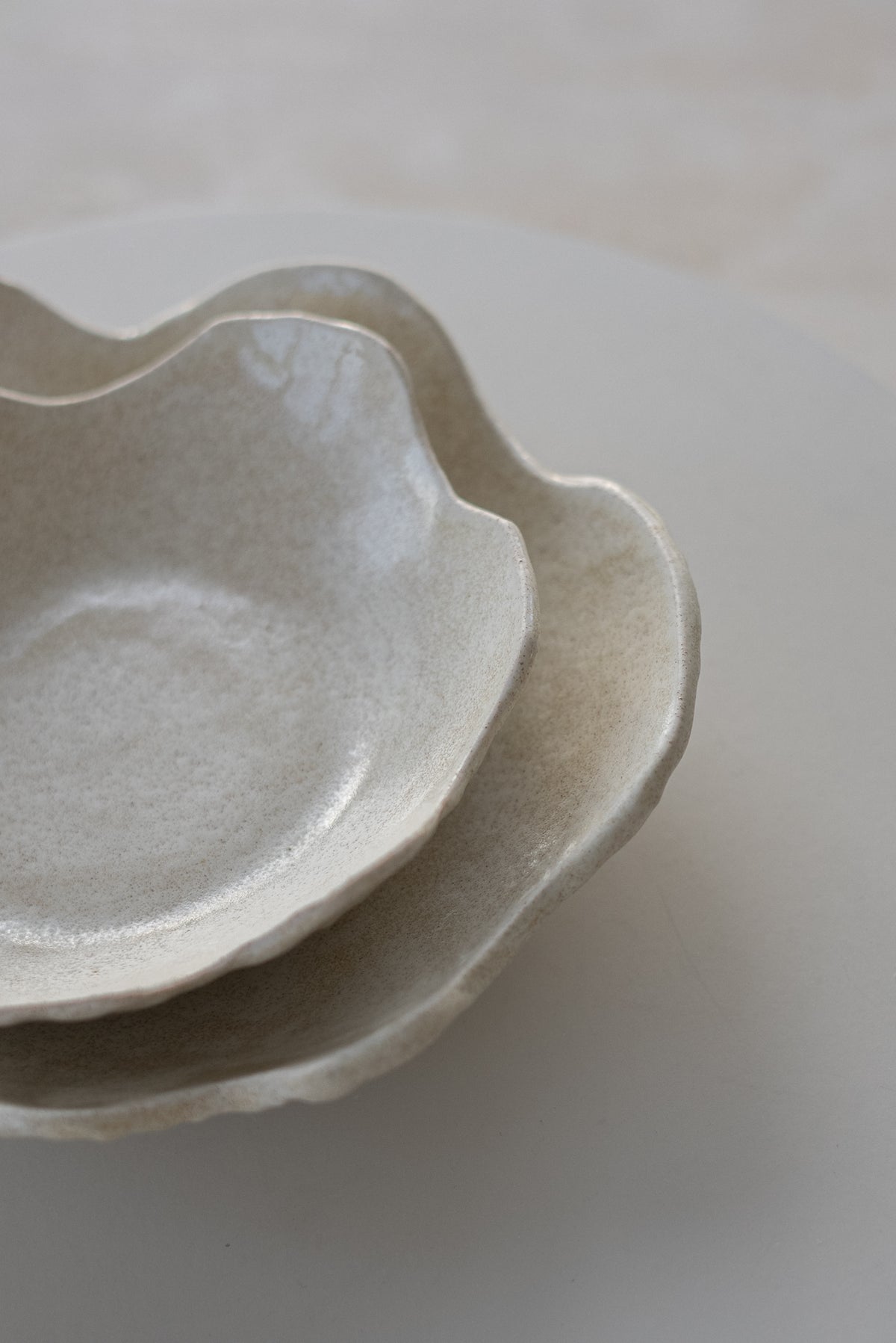 Their irregular silhouette makes them as much sculptural objects as they are functional serveware. Available as a nesting pair, each set is made in small batches and finished with a cream glaze.